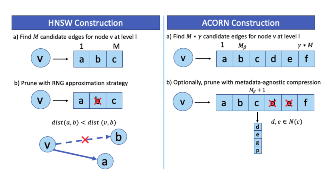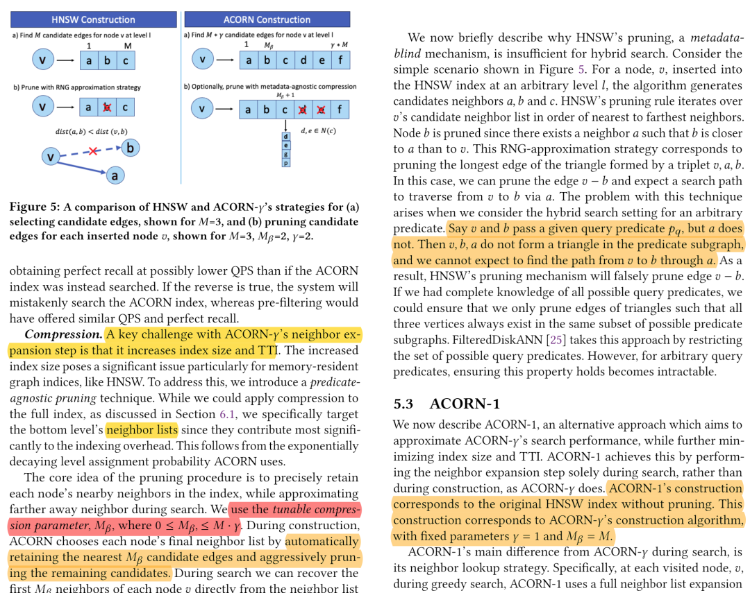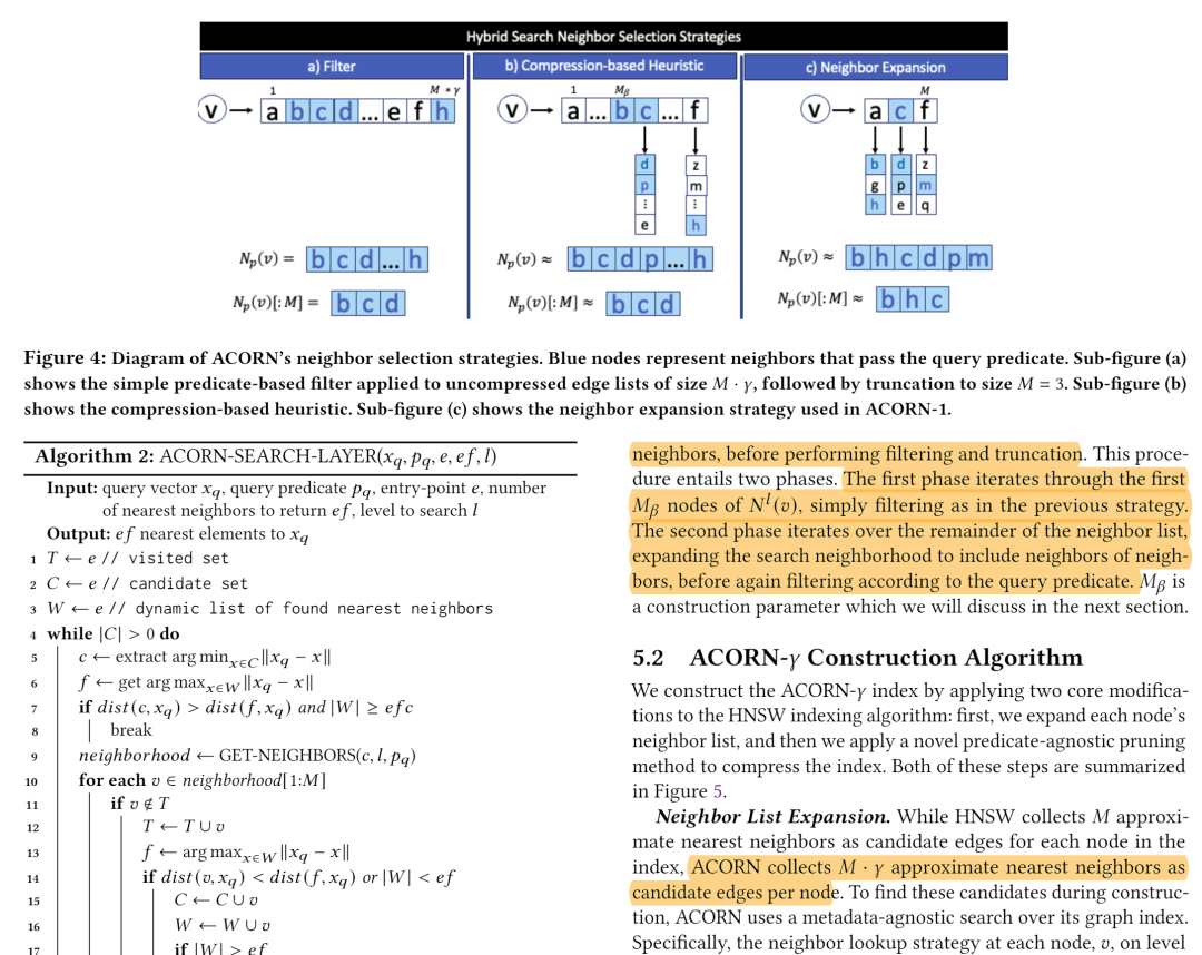 现有向量数据库普遍采用二者之一,但在选择率发生变化时则性能会大幅退化。学术界提出的一些定制索引如Filtered-DiskANN,NHQ,HQANN,一般会限制查询类型为等值查询,且标签基数普遍较小。本文提出的ACORN方法,构建了更密的HNSW,也是定制化混合索引的一种,无需先/后过滤。ACORN不仅在查询性能上有提升,而且不限制查询类型和标签基数,等值、范围、正则表达式均可以查询,且对标量标签的基数没有限制。关键算法