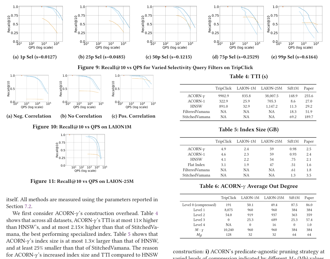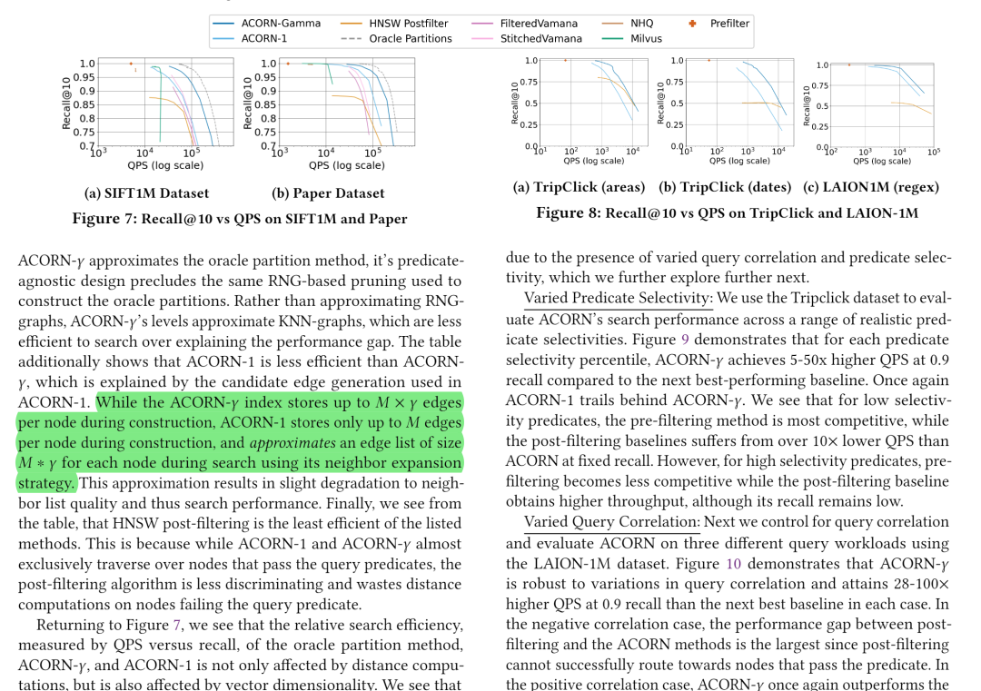 ACORN对HNSW的结构进行微调,使得在多种选择率下均可以获得足够的图连通度,保证召回率。