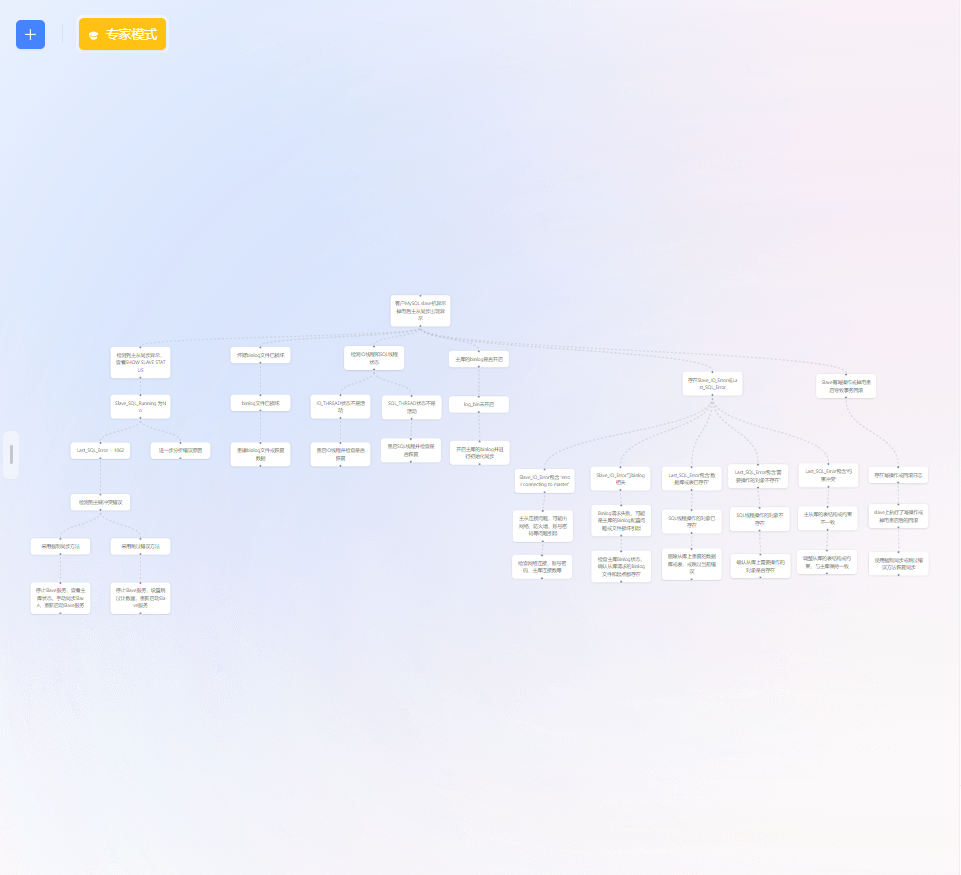 专家模式在第一轮对话开始后,会根据问题生成【根因分析树】,展示 ChatDBA 对问题的排查逻辑,方便启发 DBA 快速定位问题。