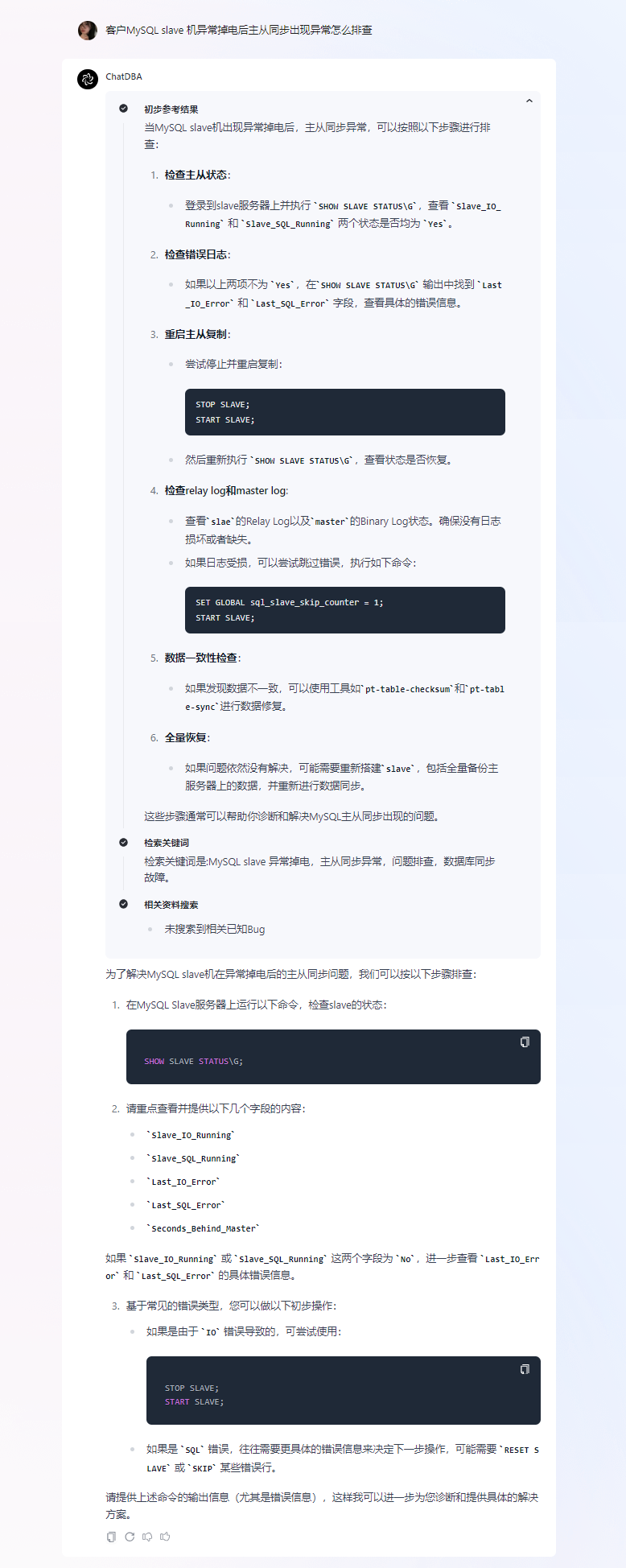 ③ ChatDBA 给出排查步骤,提醒需要收集 MySQL Slave 的具体状态 来进一步分析,同时给出具体的查询命令以及需要重点观察的内容。