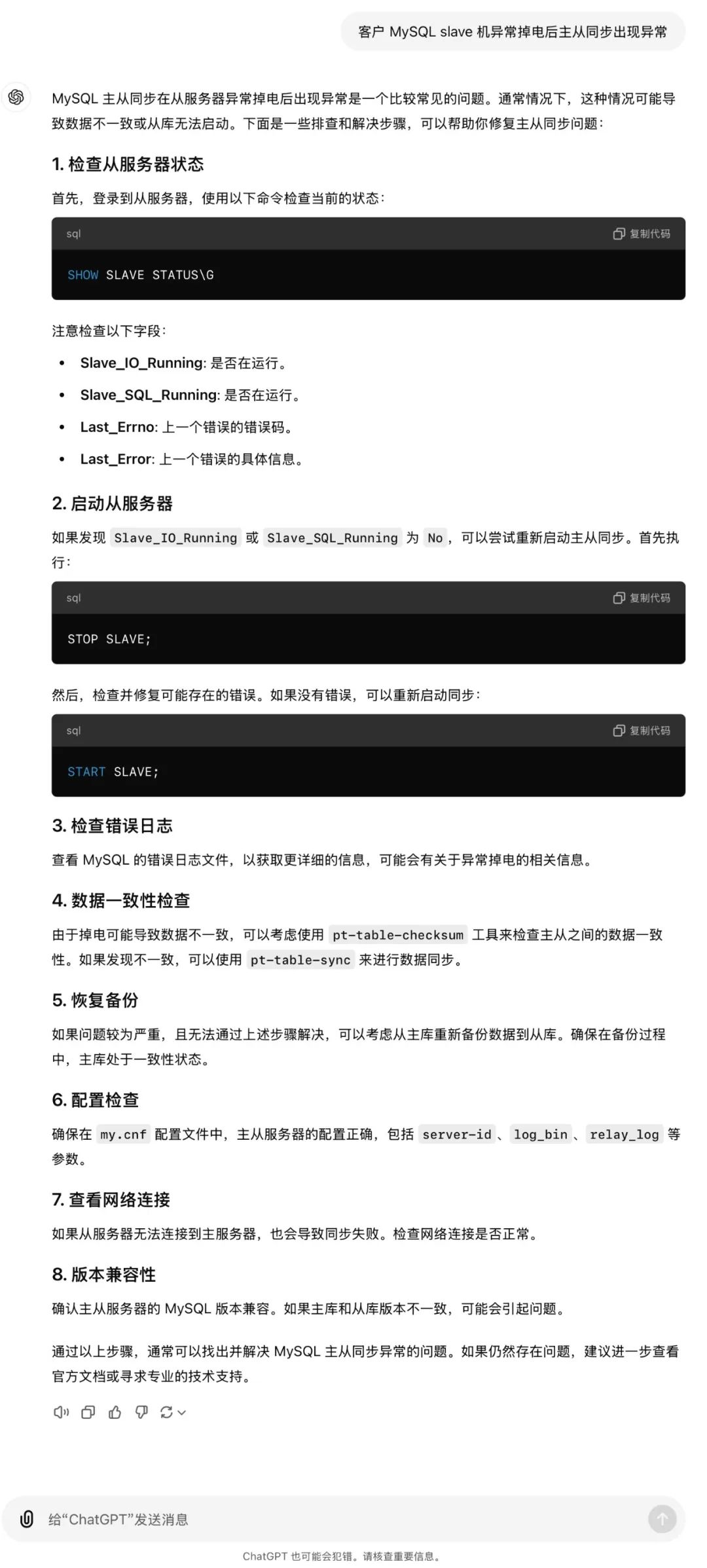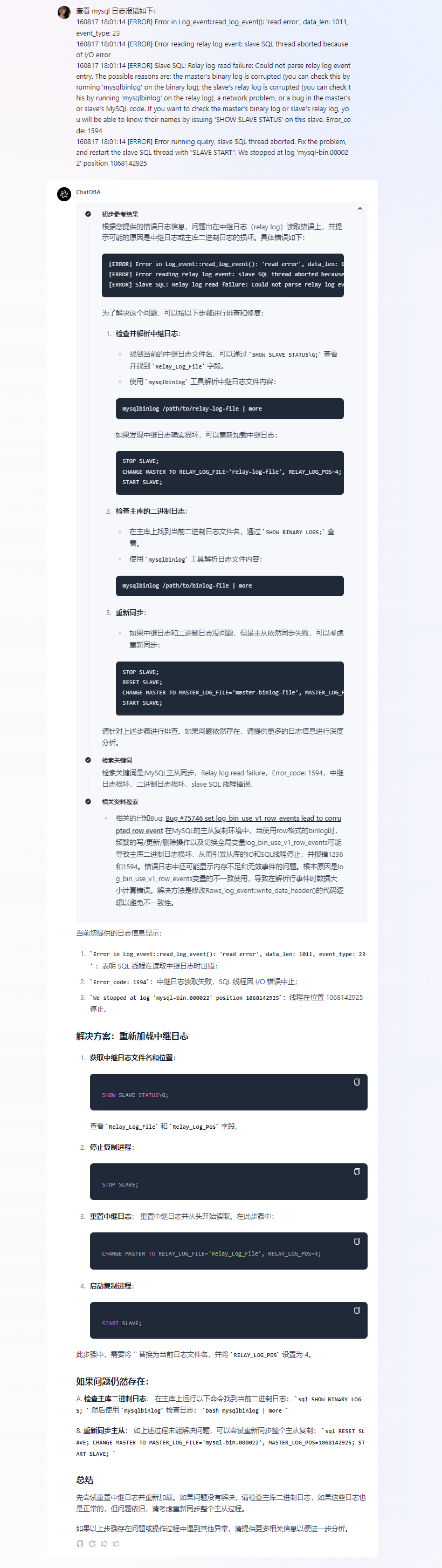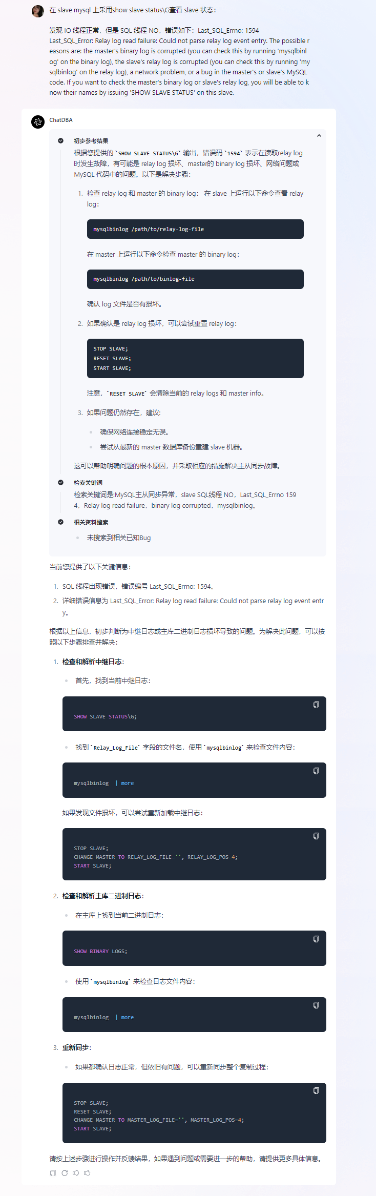 ① ChatDBA 根据 MySQL Slave 的具体状态以及报错信息,初步判断问题是由MySQL Slave 的中继日志或 Master 的二进制日志损坏导致的。