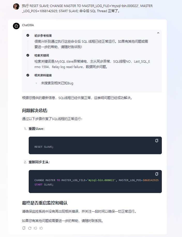 根据上一轮 ChatDBA 给出的解决方案,客户顺利解决了问题!👍👍👍