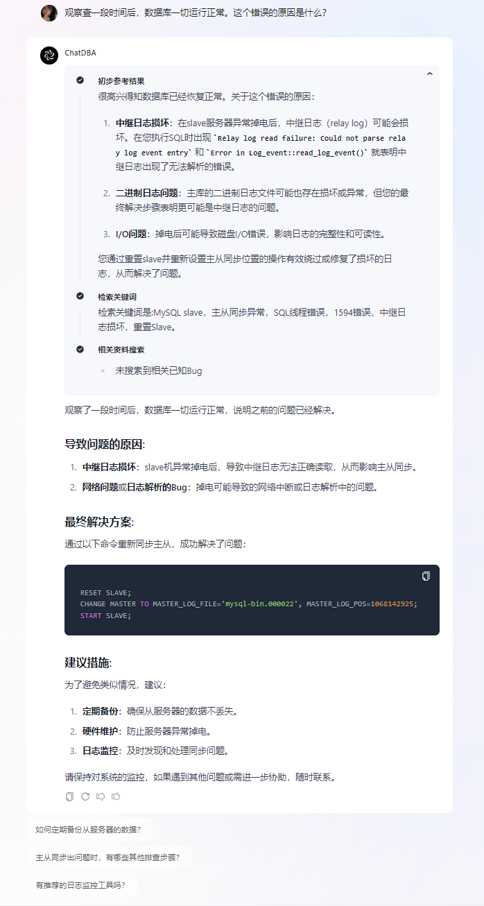 ② ChatDBA 总结了 导致问题的原因、最终解决方法,并给出避免产生类似情况的 建议措施。👍👍👍