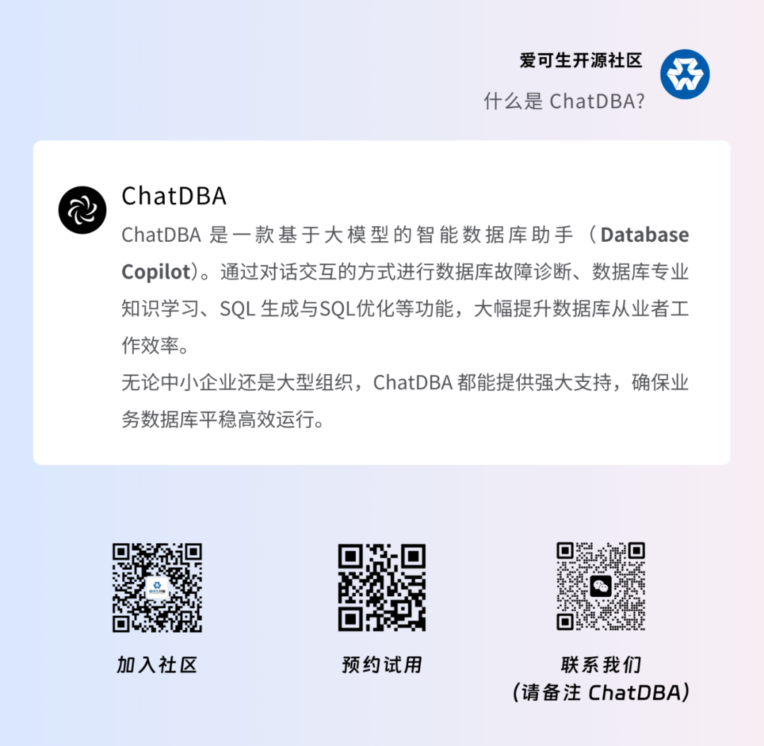 社区王牌专栏《一问一实验:AI 版》改版以来已发布多期(51-57),展现了 ChatDBA 在多种场景下解决问题的效果。我们先后收到了近两百人次的试用申请,对此我们表示感谢 🤟。