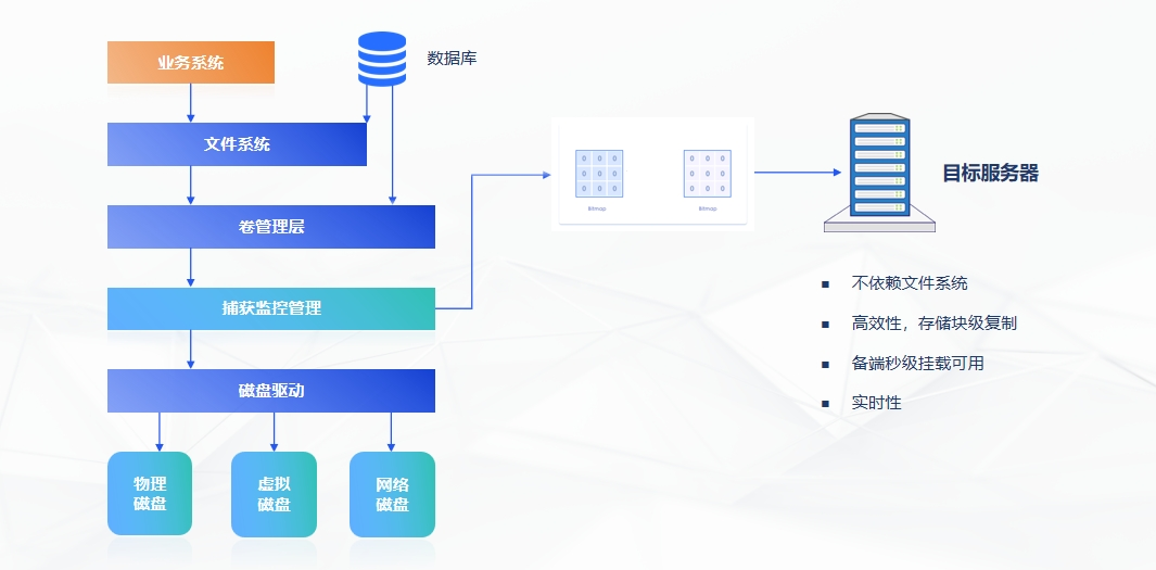 块级复制技术是指在生产服务器的文件系统之下和磁盘驱动之上的卷层设置驱动模块,实现磁盘数据变化的捕捉。通过对生产服务器磁盘空间进行划分,构建磁盘位图,将发生数据变化的位图信息发送至目标服务器并与前次位图信息进行整合,实现数据的复制。和字节级复制相比,块级复制颗粒度较粗,单次传输数据量较大,适用于具有海量文件的文件系统或者非标准化文件系统的场景,在定时备份领域具有较强的优势。