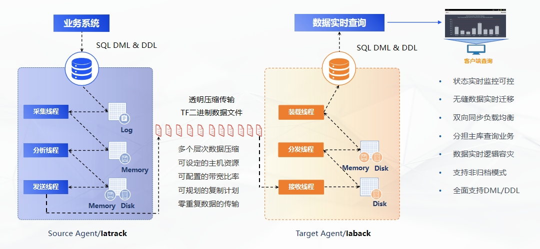 数据库层复制通常采用逻辑复制的方式,将源数据库中的重做日志和归档日志解析出SQL 语句后,发送至目标数据库,在目标数据库上重做 SQL 语句实现数据复制。逻辑复制的优点在于可以实现不同品牌数据库之间的数据复制,且能实现数据库读写分离、多活,用于各种数据库数据容灾、高可用、读写分离等场景。