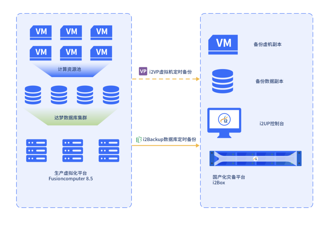 首先,利用i2vp模块实现业务系统的无代理备份,对运行在fusioncomputer虚拟化环境内虚拟机进行整机备份,当源端虚拟机出现故障无法使用,可直接整机恢复,或者恢复到其他fusioncomputer环境中。