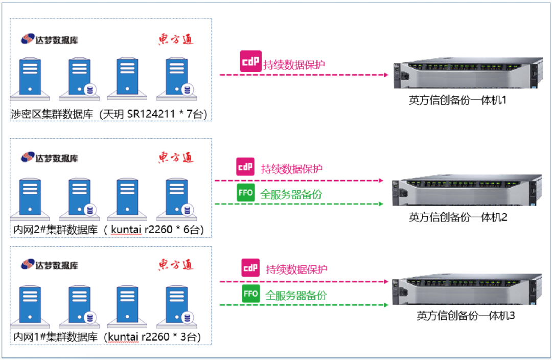 此次项目中,某档案馆需要在内网区信创服务器和涉密区涉密信创服务器业务系统进行本地备份建设。其中,业务系统运行在达梦数据库系统及东方通应用,需采用定时备份和实时备份相结合的形式进行保护,并提供定期恢复演练服务。