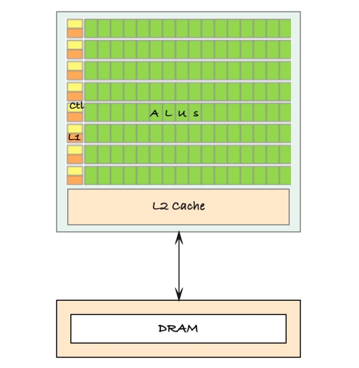 相对比于 CPU 而言, GPU在有效处理多个复杂计算任务方面的主要优势,源自其卓越的 “ 大规模并行架构 ” 设计。通常而言, GPU由数百甚至数千个小型处理内核组成,这些内核通常被称为流处理器(Stream Processors)或着色器内核(Shader Cores)。每个处理内核都配备了自己的寄存器和共享内存块,用于存储数据和执行程序指令。这种设计使得GPU能够以极高的效率同时处理大量并行任务。GPU(图形处理单元)是一种专门设计的处理器,最初用于渲染高分辨率图像以及创建身临其境的游戏图形和动画。然而,随着技术的进步,个人用户和企业现在越来越多地将GPU应用于大规模数学运算、AI/ML系统的训练与部署,以及跨行业的数据分析。GPU通常由数百到数千个内核组成,这种设计使其具备了前所未有的并行处理能力。与CPU的内核不同,CPU能够通过先发制人机制依次处理多个任务,而GPU的所有内核则能同时在不同的数据集上执行相同的数学指令。这种架构被称为单指令、多数据(SIMD),使得GPU能够高效地处理涉及重复执行复杂指令集的工作负载,特别适合于实时数据分析、区块链验证、AI/ML培训以及神经网络应用等场景。下面的GPU架构示意图清晰地展示了其内部结构和工作原理。深入分析CPU与GPU之间的基本架构差异,不仅揭示了两者在设计理念上的本质区别,还为我们在不同应用场景中合理选择计算资源提供了重要的指导依据。理解这些差异将有助于开发者和系统架构师在性能优化和资源配置时做出更明智的决策,从而更有效地利用各自的优势,满足具体的计算需求。