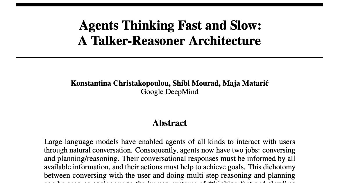这篇论文介绍了一种“Talker-Reasoner”架构,用于提升大语言模型在与用户交互时的效果。论文将该架构类比于Kahneman提出的“快思慢想”理论,其中“Talker”代理(系统1)负责快速、直观地生成对话响应,而“Reasoner”代理(系统2)则专注于多步骤推理和规划。这种模块化设计不仅提高了响应的灵活性和准确性,还减少了延迟。