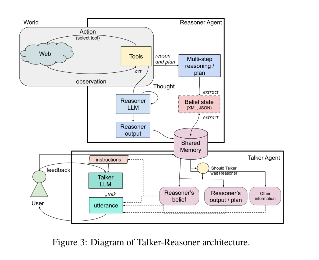 整个双系统架构如图所示。在这个双系统架构中,Agent被分为两个角色:快速直观的对话代理和较慢深思熟虑的推理代理。