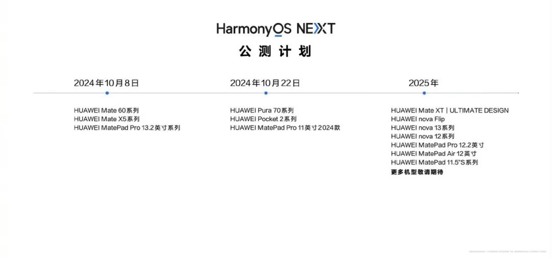 2、2025 年:华为 Mate XT | ULTIMATE DESIGN、nova Flip、nova 13 系列、nova 12 系列、MatePad Pro 12.2 英寸、MatePad Air 12 英寸、MatePad 11.5"S 系列开启公测。