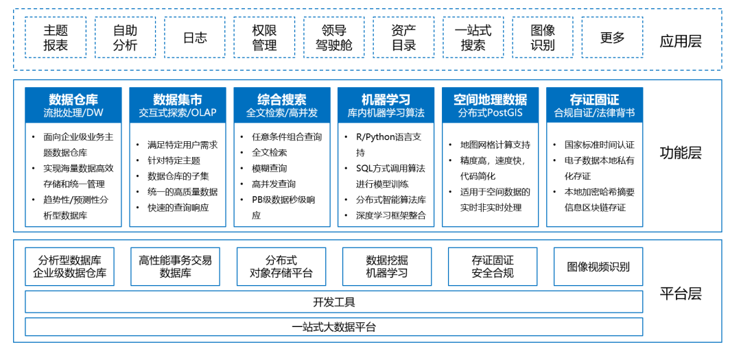 “中科超云数据库一体机”采用独特的MPP并行计算框架设计,在加载、计算、访问等各个环节实现最大化的并行数据处理,读写混载能力优秀,对于大规模数据实现低时延、高性能计算;支持HTAP特性,提供对传统数仓、实时数仓、数据湖多个大数据场景的支持;内置机器学习、GIS地理空间位置计算、图计算、时间序列分析等多种分析能力,大幅提高分析和管理效率;除ANSI SQL,还支持R、Python、Perl、Java、C等扩展,用户可灵活进行功能扩展。