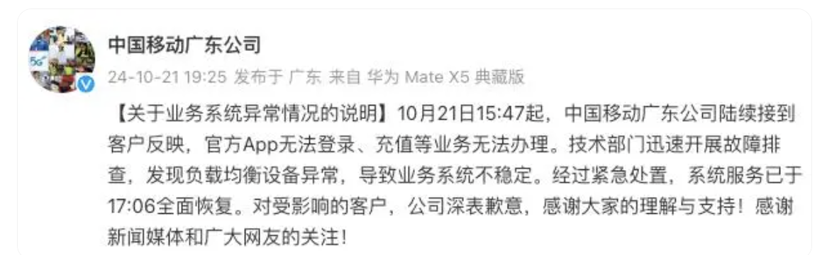 中国移动广东公司回应业务系统异常情况:负载均衡设备异常导致业务系统不稳定,已全面恢复!中国移动广东公司今天晚间发布《关于业务系统异常情况的说明》,表示经过紧急处置,系统服务已于17:06全面恢复。
