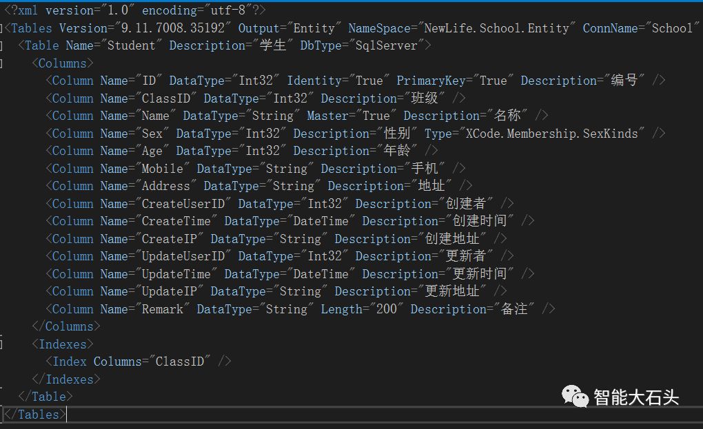 从上面可以看到,读取dal.Tables得到了这个连接的所有表结构信息,输出为Xml时,跟前面用来创建实体类的模型文件极为相似。