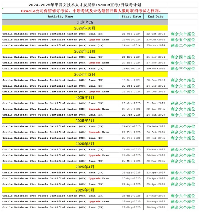 2024年10月-2025年5月 Oracle 19c OCM 考试安排: