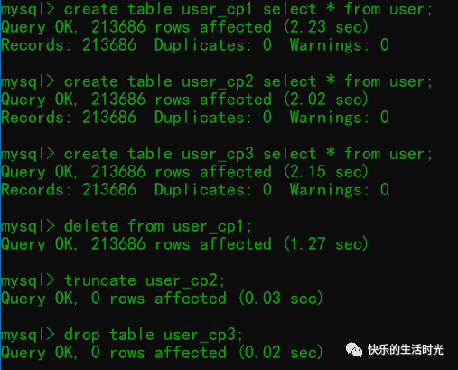 注释:user 是一张含有213686条数据的表,Innodb引擎。分别复制相同数据的三张表,使用三种不同的命令进行处理,执行时间如图。