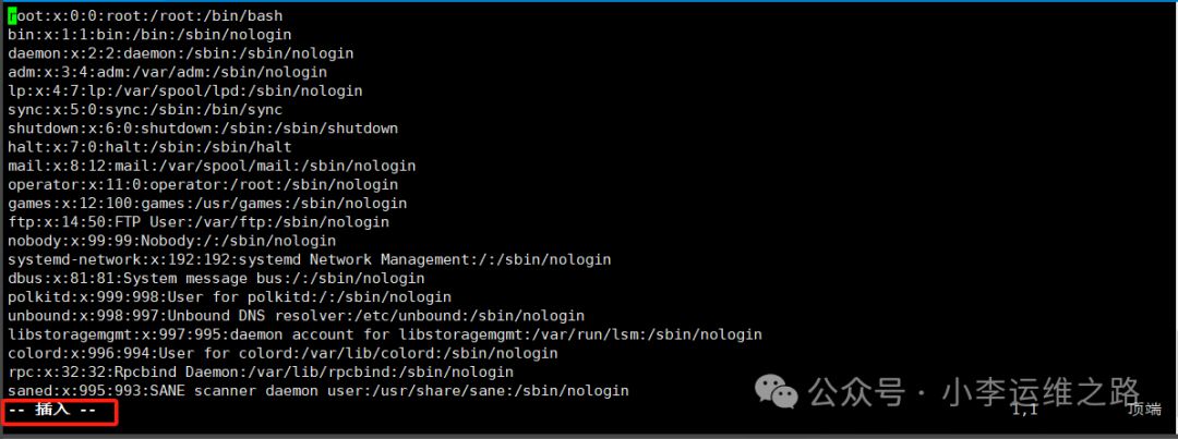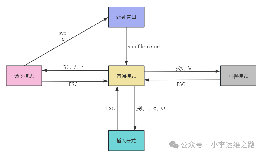 该模式就类似 window 中操作文本文件,普通模式下可通过输入“i”,“o”等字符即可进入插入模式。编辑完成后按 ESC 键退出到普通模式。