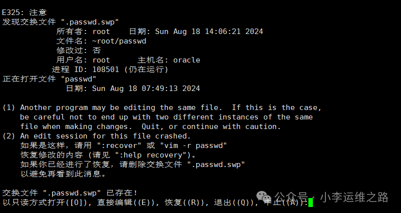 直接删除自动生成的临时文件file.swp或者报错界面直接输入D放弃编辑