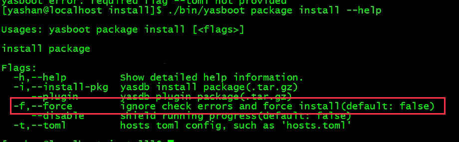./bin/yasboot package install -t hosts.toml -i yashandb-personal-23.2.3.100-linux-x86_64.tar.gz --force