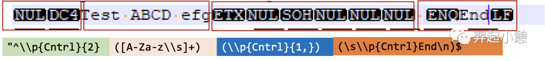 int[][] asciis = {{0,20}, {3, 0, 1, 0, 0, 0, 32, 5}};String matchedStr = ascii2String(asciis[0]) + "Test ABC efg" + ascii2String(asciis[1]) + "End\n";String pattern = "^\\p{Cntrl}{2}([A-Za-z\\s]+)(\\p{Cntrl}{1,})(\s\\p{Cntrl}End\n)$";Matcher keyMatcher = Pattern.compile(pattern).matcher(matchedStr);if (keyMatcher.find()) {System.out.println(keyMatcher.group(0));System.out.println(keyMatcher.group(1));System.out.println(str2Ascii(keyMatcher.group(2)));System.out.println(str2Ascii(keyMatcher.group(3)));}