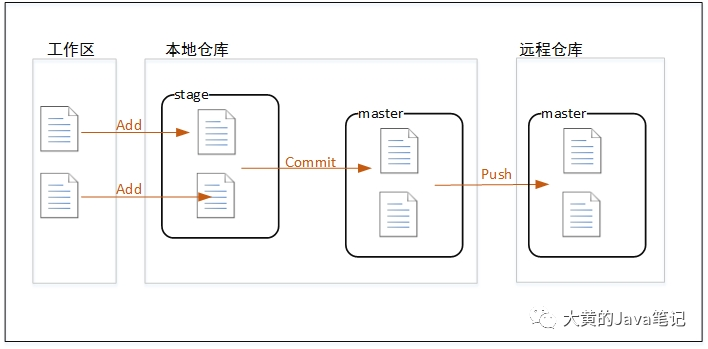 下图是Git与提交有关的三个命令对应的操作,Add命令是把文件从IDE的工作目录添加到本地仓库的stage区,Commit命令把stage区的暂存文件提交到当前分支的仓库,并清空stage区。Push命令把本地仓库的提交同步到远程仓库。