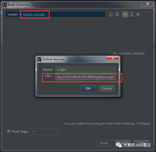因为是第一次提交,Push前需要指定远程仓库的地址。如下图,点击Define remote后,在弹出的窗口中输入远程仓库地址。