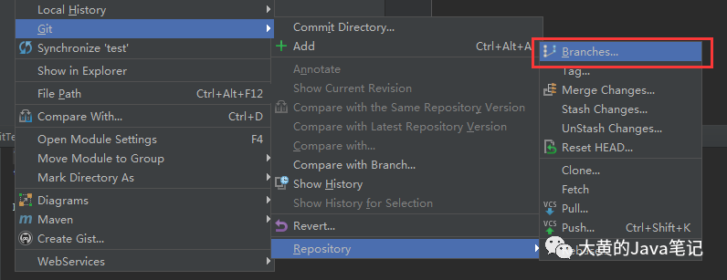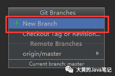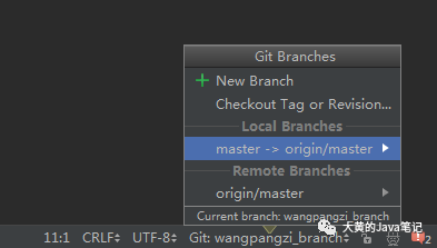 创建完成后注意IDEA的右下角,如下图,Git: wangpangzi_branch表示已经自动切换到wangpangzi_branch分支,当前工作在这个分支上。