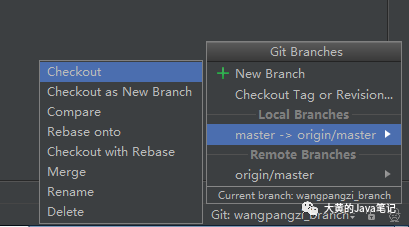 点击后弹出一个小窗口,在Local Branches中有其他可用的本地分支选项,点击后选择Checkout即可切换当前工作的分支。