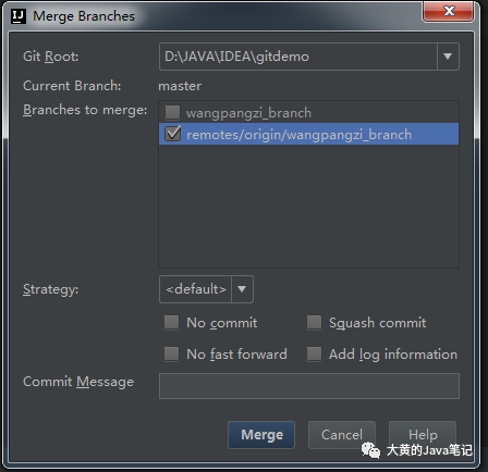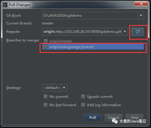 使用Pull功能打开更新窗口,点击Remote栏后面的刷新按钮,会在Branches to merge栏中刷新出新的分支。这里并不想做合并,所以不要选中任何分支,直接点击Pull按钮完成操作。