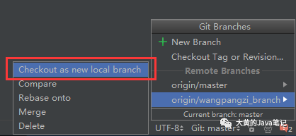 更新后,再点击右下角,可以看到在Remote Branches区已经有了新的分支,点击后在弹出的子菜单中选择Checkout as new local branch,在本地仓库中创建该分支。完成后在Local Branches区也会出现该分支的选项,可以按上面的方法,点击后选择Checkout切换。