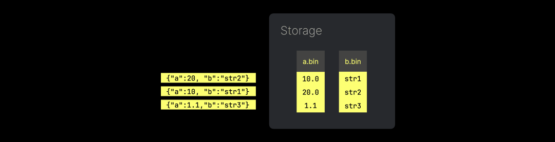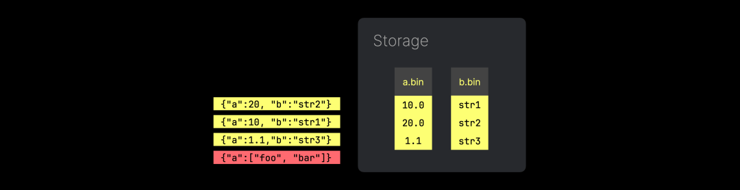 相反,我们希望以密集存储的方式保存每个唯一 JSON 路径的值,避免冗余。这同样能够让 JSON 存储扩展到 PB 级别数据集,并实现高性能的分析。