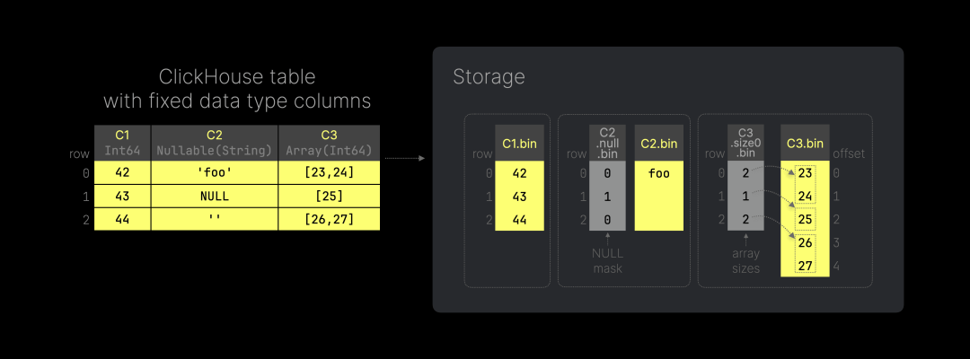 下方的 SQL 代码可以用来重现上图中的示例表。我们将列 C 定义为变体类型,指定其可以存储整数、字符串和整数数组的混合值。对于这样的列,ClickHouse 会将每种具体数据类型的值分别存储在独立的子列中(这些变体类型的子列数据文件与前面示例中的列数据文件几乎相同)。例如,所有整数值存储在 C.Int64.bin 文件中,所有字符串值存储在 C.String.bin 文件中,依此类推。