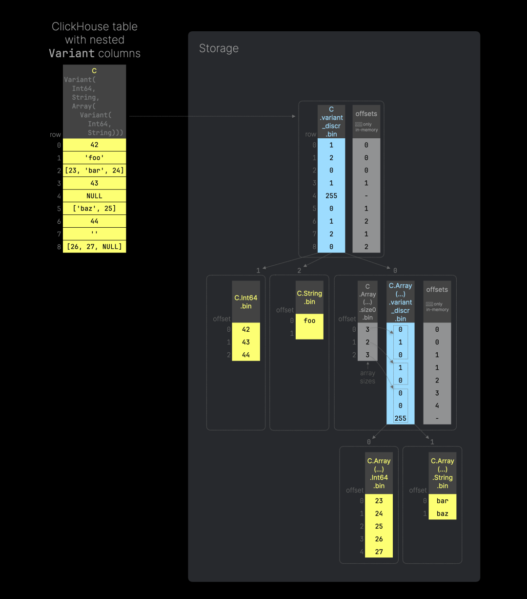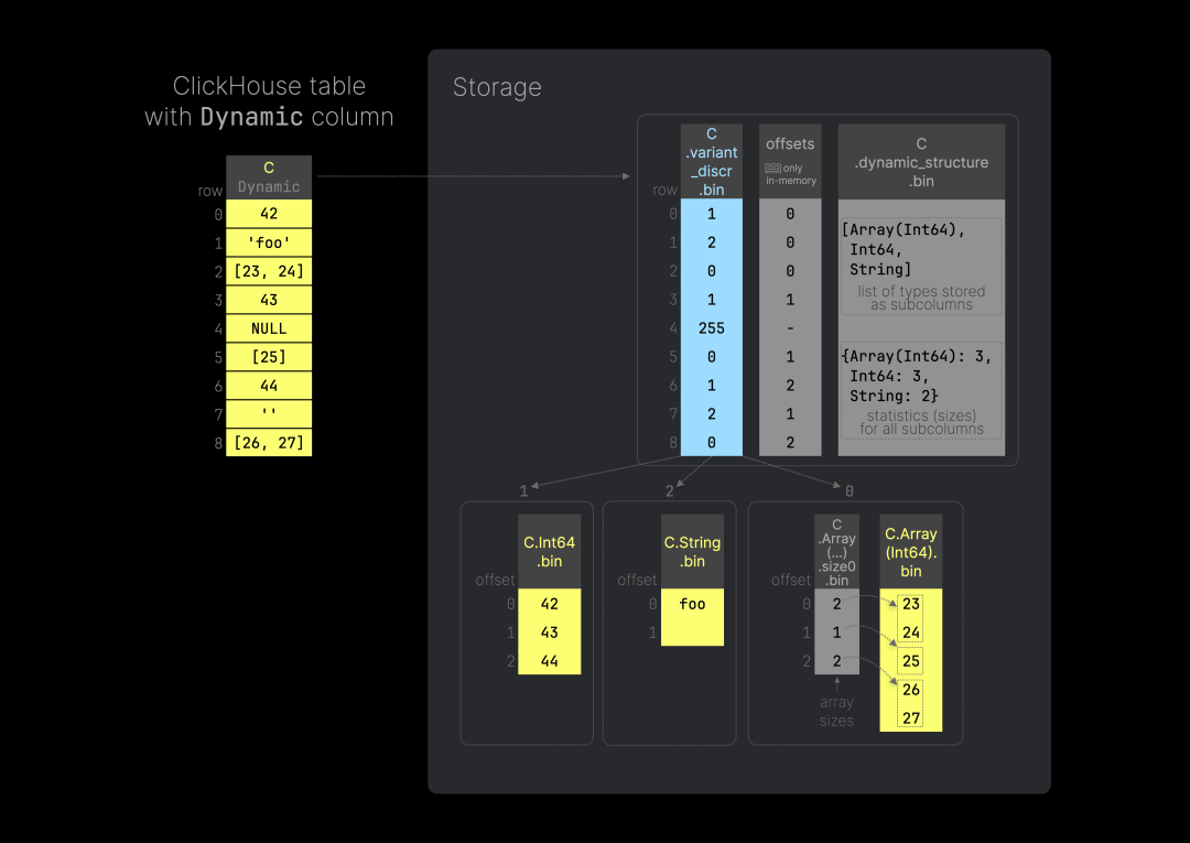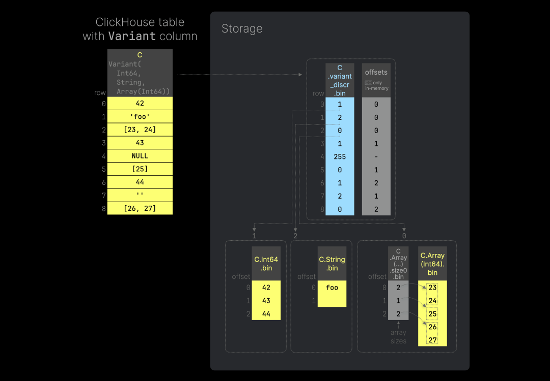 你可以在此处找到用于复现上图的 SQL 代码。这次,我们定义了变体列 C 来存储整数、字符串,以及包含变体值的数组——其中既有整数也有字符串。上图展示了 ClickHouse 如何在数组列的数据文件中嵌套使用我们之前介绍的变体存储方法,从而实现嵌套的变体类型。
