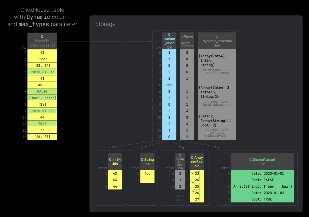 动态类型还支持通过指定 max_types 参数来限制存储为独立列文件的类型数量:Dynamic(max_types=N),其中 0 <= N < 255。默认情况下,max_types 的值为 32。当达到设置的类型数量限制时,剩余的类型将存储在一个特殊结构的单列文件中。下图展示了该示例(可点击放大查看):
