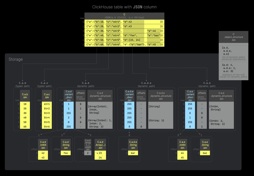 该表列包含 6 个 JSON 文档,每个唯一 JSON 键路径的值会存储在磁盘上。对于具有类型提示的 JSON 路径(见上图中的 C.a.b 和 C.a.c),这些值会作为常规列数据文件存储;而对于可能包含动态变化数据的 JSON 路径(见上图中的 C.a.d、C.a.d.e 和 C.a.e),这些值会作为动态子列存储。对于后者,ClickHouse 使用动态数据类型进行存储。