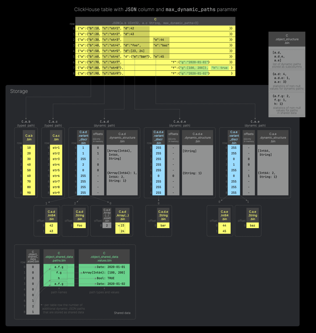 (2) 使用 max_dynamic_paths 参数(默认值 1024),限制以子列形式单独存储的 JSON 键路径数量。