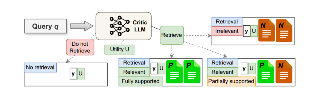 不需要检索([NoRT]):当添加的检索标记为 [NoRT] 时,直接生成答案并标记为“[NoRT]”。 需要检索([RT]):添加的检索标记为 [RT] 时,创建三个不同的新实例。首先使用R来检索前k个文档S。对于每个检索到的文档,Critic LLM 评估是否相关,并返回相关性标记。 完全支持([Fully Supported]):所有段落都预测为[RT],则添加“ [Fully Supported]”作为基础标记。 部分支持([Partially Supported]):部分段落预测为[RT],则添加“ [Partially Supported]”作为基础标记。 不相关([Irrelevant]):使用与问题不相关的文档,标记为“[Irrelevant]”。 相关([Relevant]):当预测为[Relevant]时,使用Critic LLM 评估支持度。