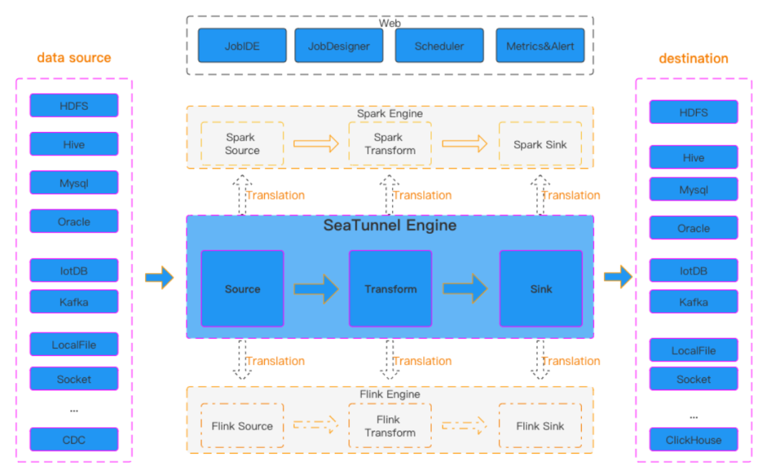 则是将输入数据转换为目标数据的插件。SeaTunnel 支持多种执行引擎,包括其自带的 Zeta 引擎,以及 Flink 和 Spark。