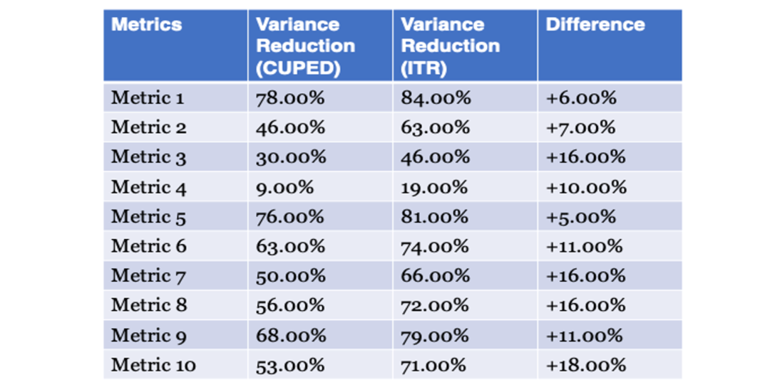 其一,ITR需要兼容各种复杂程度的因果链路。因此,推断实验前和实验中数据的相关性关系时,需要使用不同复杂程度的预测模型。其二,不同复杂程度的模型,可能会给出截然不同的实验前数据和实验中数据相关性结果。这个时候如何取舍不同模型的结果,便是关键。这里,我们借鉴了机器学习中的常用的堆栈技术(stacking)。第一阶段,ITR会使用多种不同复杂程度的模型,包括简单的线性模型、中等复杂程度的决策树模型以及非常复杂的神经网络模型。在不同的复杂程度下,学习原始数据下实验前后数据的相关性。我们的最终目标是对实验中的结果进行预测,为此,每个模型都生成了一个由实验前数据“预测”的实验中数据预测结果。第二阶段,是堆栈过程。即使用第一阶段的预测结果来学习实验中数据,来优化不同模型结果在第二阶段预测中的权重。从而有更高的概率为能够准确描述真实数据生成过程的模型增加权重,达到提升总体预测准确度的目的。- 实践收益