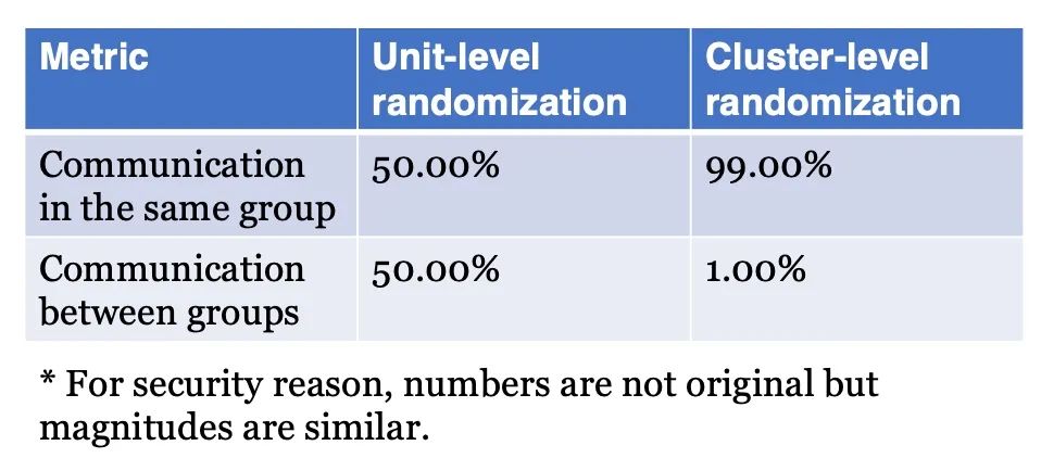 在实验设计中,最常见、历史也相对悠久的方法便是是基于社交网络的聚类分流(cluster randomization)。该方法的思路很简单,就是根据实验开启前一段时间内用户较为稳定的社交关系状况,将他们分割为若干个互不重叠的聚类(cluster,每个cluster相当于一个disjoint set),使得用户间的社交互动活动绝大部分处于聚类内部,而不是聚类之间。此时,策略的随机分配的粒度是在聚类上的,而非用户个体。在这个例子中,我们按照群聊组的关系,大致分割出了如下图所示的三个区块。左侧群组对应的聚类全上了策略,而另外两个群组对应的聚类则没上策略。如果假设每个群聊群组,需要超过一半的用户进入实验组才能将群组中的其他对照组用户带偏到近似于实验组的状态(类似于感染contagion),那么在上面的例子中,分入对照组的两个聚类都因不满足要求而保留着对照组该有的状态,社交溢出没有发生。此时,类似于传统AB实验,我们可以近似认为不同聚类间满足相互独立,潜在结果也只有两个,并能通过实验组-对照组分别观察到。这个想法看似直观简单,但实际操作起来却仍存在一些难题,比如:首先,社交实验通常面对的是庞大的用户群体,即超大超复杂且较为动态的社交关系图。工程上如何准确快速拿到社群划分结果,便是很大的挑战。聚类分流实验通过在聚类粒度上完成分析来实现对社交溢出的隔离,减小干涉效应带来的偏差。但随着分析粒度从个体粗化到聚类,样本量也同时在锐减,导致实验灵敏度的巨大损失。其本质上是一种bias-variance的对冲。一个好的聚类实验的设计,在于科学地找到bias-variance之间的平衡点。针对上述两个问题,抖音集团实验平台分别给出了一些初步解决方案。目前,抖音集团图平台提出了一套并行的Leiden算法,简称Parleiden。该算法既保留了传统Leiden算法相较于Louvian算法不产生断链的优势,同时巧妙地解决了传统Leiden算法并行化的难题。相比于非并行化的传统Leiden算法,并行化的Parleiden快了约 10 倍,能对一个拥有约 1 亿个节点和约 300 亿条边的超大社交网络图在几个小时内完成满足隔离度要求的社区划分,有效解决了效率问题。灵敏度方面,Parleiden也可以通过设置每个社区单元中用户数量的上限,在一定程度上保证样本量。CUPED在很多场合,可以有效缓解聚类粒度分析带来的样本方差放大。实践表明,通过CUPED方法加工的社群实验指标的样本方差可以和普通AB实验的非CUPED指标保持相当的量级。父子实验实现了对一个实验同时进行个体粒度分流和社群粒度分流。当社交溢出不是特别强的时候,干涉效应带来的偏差可能比较低,因而个体粒度分流的子实验结果和社群粒度分流的子实验结果会比较接近,这时候使用个体粒度分流的子实验作为分析对象,可以大大提升灵敏度。类似于传统AB实验,使用命中活跃用户进行分析,由于用户间更高的同质性,可以有效降低样本方差。但同样也会带来复原大盘的外部有效性问题。- 实践收益