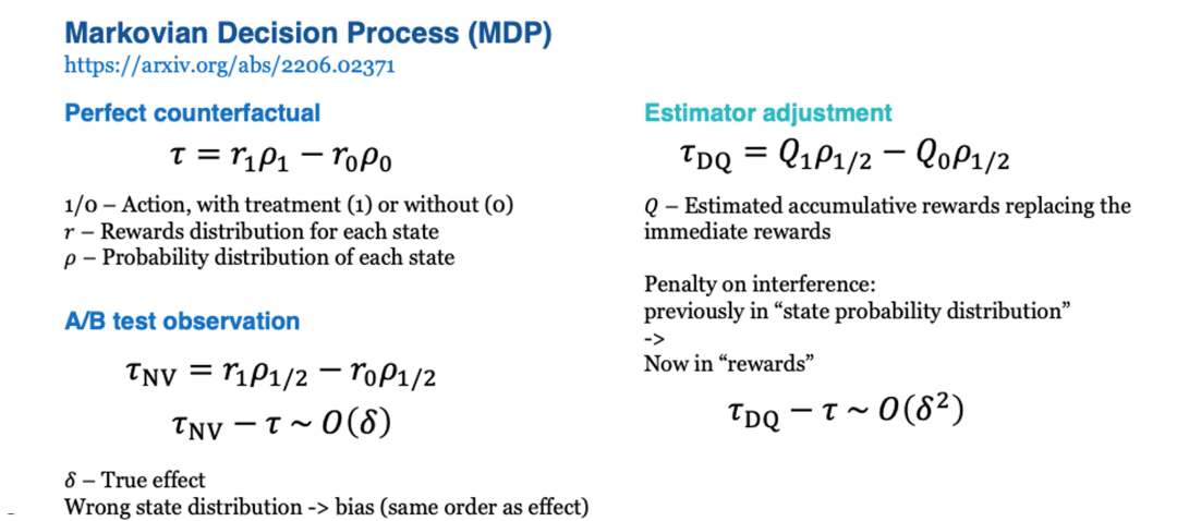 实验设计外,解决干涉问题的第二路径便是统计调整(post experiment analysis)。统计调整类方法纠正干涉效应偏差,但基于某些假设,统计调整方法通过构造新的统计量,来对干涉效应引入的偏差进行修正。统计调整的具体方法有很多,这里着重介绍一下抖音集团实验平台在2023年与麻省理工大学、哥伦比亚大学和英属哥伦比亚大学合作的项目(参考链接:https://arxiv.org/abs/2305.02542)。该方法基于马尔科夫决策过程(Markovian Decision Process,简称MDP),利用强化学习,来对干涉效应偏差进行修正,主要用于解决双边市场关系等间接干涉场景。间接干涉场景下的核心是有限的资源位,实验组由于策略的刺激过度挤占了与对照组共享的资源位导致对照组指标水平下降因而高估真实的因果效应。MDP可以很好地描述资源位在空置和被占用不同状态间的转换过程,其转移矩阵的稳态分布$$\rho$$指代了供需关系平衡条件下占据到和未占据到资源位的两种状态(state)各自的概率分布。