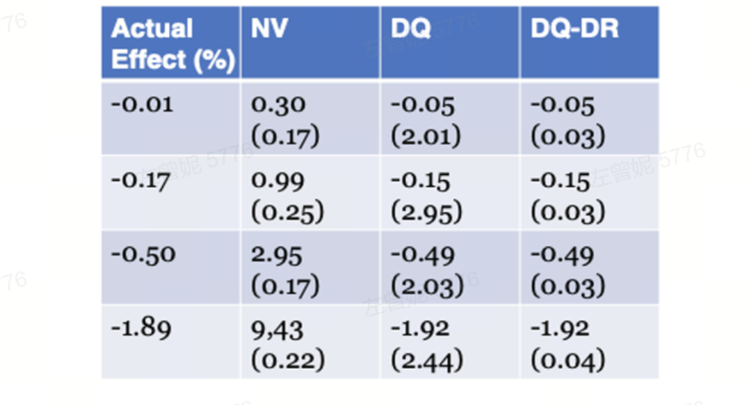 使用DQ统计量则预估效应为下降-0.49%,高度还原了真实效应。如果再配合上一些降方差的双稳健手段(DQ-Doubly Robust,简称DQ-DR),我们可以进一步大幅缩减预估时的方差,加大结论显著置信的几率。/ 选择困难