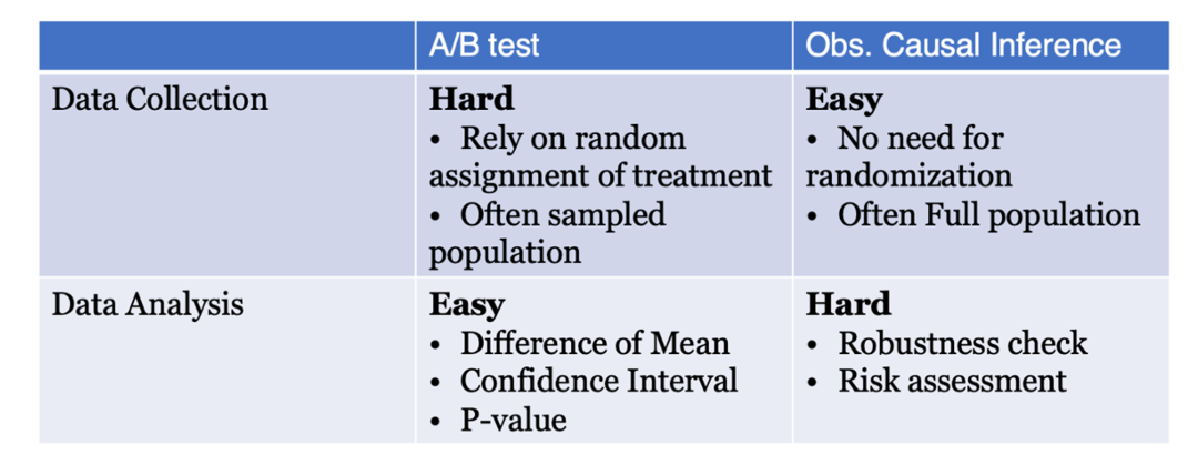 截至2023年末,大约执行了 12,000 个任务,总体内存收益率约为 50%,非常可观。其中,76.2%的任务的内存收益率超过了 60%。目前,调参覆盖的Spark任务规模还在不断扩大,远超出 12,000 个任务。例如,随机实验在理论上需要保障策略的分发是随机的,但当对照组用户发现自己没有被分发到新策略并享受新策略可能会给自己带来的潜在收益时,就有可能会引发对照组用户对于服务公平性的不满与投诉。因此,在当法律、道德、公平性以及强制性等方面无法完全满足时,随机实验只好黯然退出。此时,基于观察数据的因果推断(observational causal inference)就成为了一个非常好的替代方案。对比传统 A/B 实验和观察因果推断,会发现以下不同。传统A/B实验的数据采集过程相对困难,因为它需要进行随机分流,以及完善的大数据基础设施和配套,前期要投入大量成本。而且,基于成本考量,A/B实验通常只会获取采样数据。基于采样数据结论的外部有效性(external validity)则可能无法得到保障。相比之下,观察因果推断的数据收集则容易很多,成本也较低,只需实施策略,并观察一段时间即可。此外,观察因果推断的另一个优势是其通常为全量数据,无需进行采样,外部有效性的问题大减。然而在分析层面,A/B实验与观察因果推断的难易程度却截然反转。A/B实验的分析相对简单,解读的成本也较低。通过一些简单的统计方法,如Difference in Means、置信区间和 p 值,这些方法都是相对直观且容易沟通的。更重要的是,A/B实验的结论至少在采样范围内是准确的金标准。相反,观察因果推断后期的分析受限于很多可能无法被证实的假设,因此结论稳健性以及连带的风险评估大大增加了沟通成本。这一块也成了抖音集团实验平台推出自己观察因果推断产品的发力点。以经典的“倾向分匹配”算法(Propensity Score Matching)为例,该算法需要从多维度进行稳健性的判断,诸如匹配质量,模型稳健,未观测混杂以及合理控制。● 匹配质量方面,我们会查看匹配前实验/对照两组倾向分分布的共同支撑集。只有共同支撑集足够大,才能保障优质反事实配对的比例。