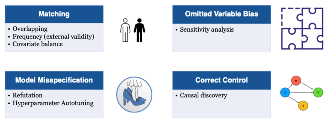 由于观察因果推断在分析层面的复杂性,风险评估不能只依赖一些具备标准的自动化检测,也依赖业务经验的输入,包括许多相对主观的评估。