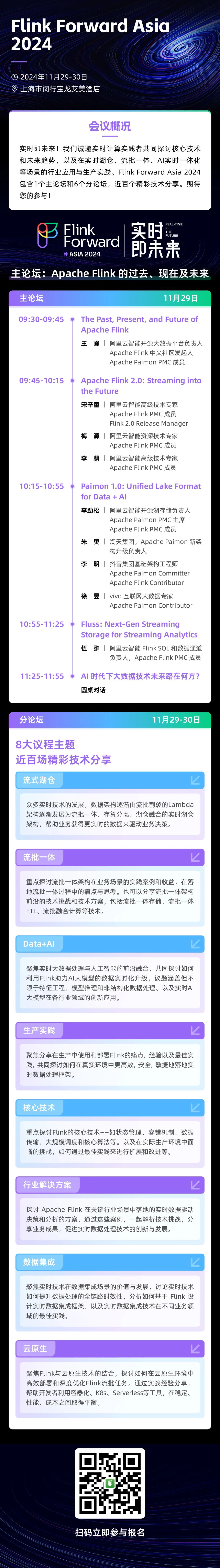 作为 Apache Flink 社区的年度技术盛会,本次主论坛的主题定为“Apache Flink:回顾过去,展望未来”。在两日的议程中,大会将围绕8大核心议题,带来近百场精心策划的专业演讲,深入探讨流式湖仓、流批一体、Data+AI 融合、数据集成以及云原生等前沿技术的发展趋势。这不仅是了解 Flink 社区最新动态和发展计划的绝佳机会,更是与同行分享生产实践经验、交流技术成果的重要平台。无论您是开发者还是数据领域的从业者,都不可错过这场汇聚行业精英的盛会!