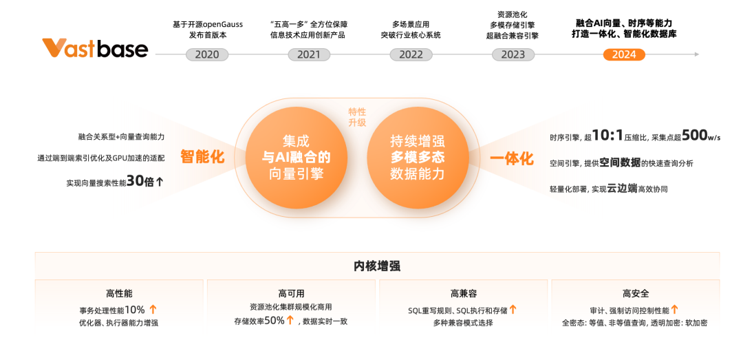 在智能化方面,Vastbase融合了关系型和向量查询能力,通过端到端索引优化及GPU加速的适配,实现向量搜索性能30倍的提升。