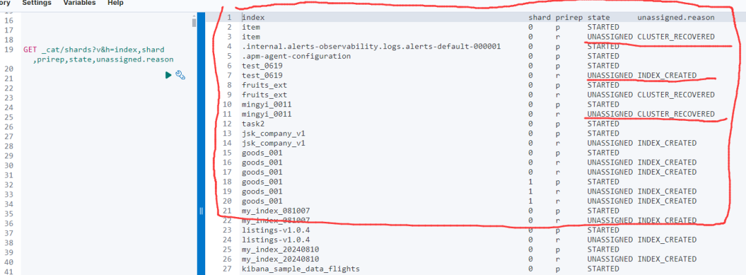 字段,确保没有未分配的分片。如果发现未分配的分片,可以使用以下命令重新分配: