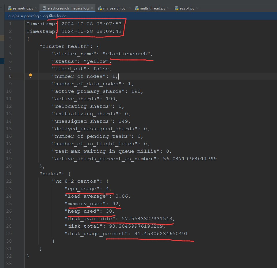 日志将以 JSON 格式保存,记录每次获取到的集群和节点状态。(如下图所示)