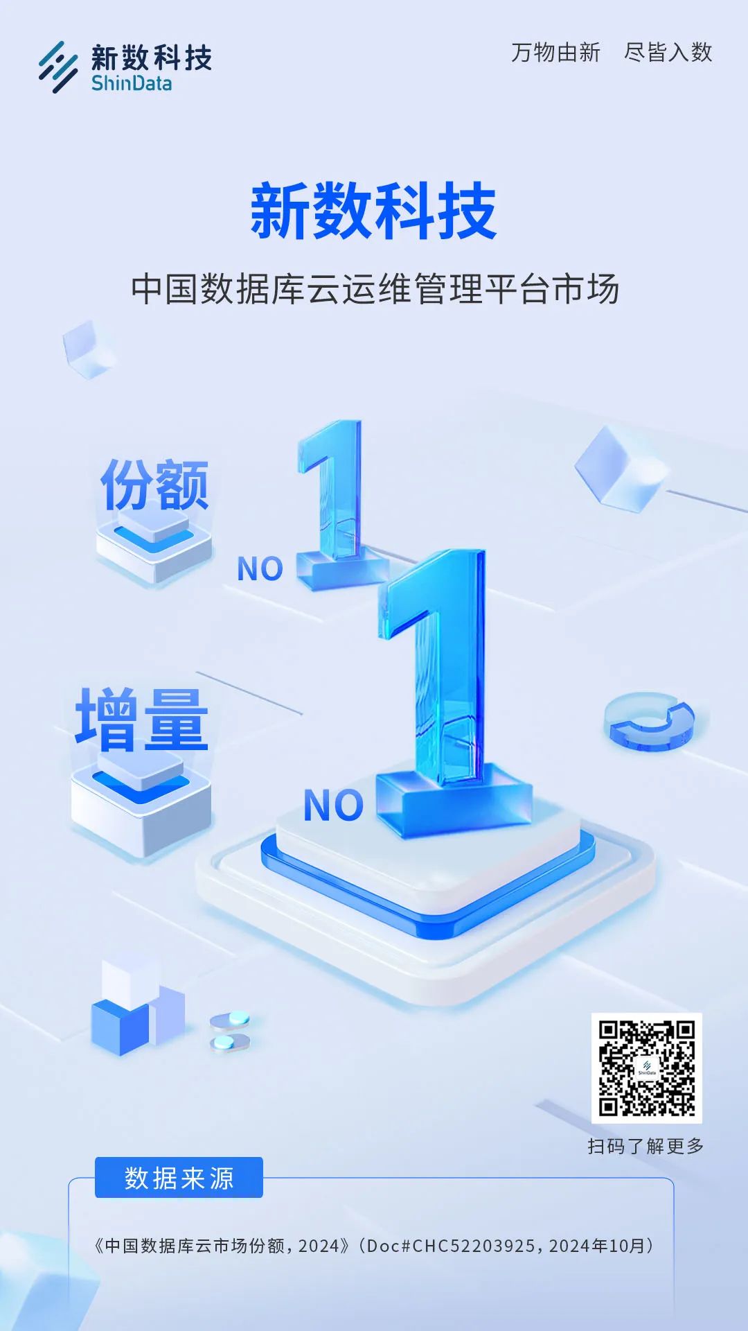 近日,全球领先的IT市场研究和咨询公司IDC发布了《中国数据库云市场份额,2024》(Doc#CHC52203925,2024年10月)。报告数据显示,在中国数据库云市场中,各数据库生态厂商持续展现强劲的增长势头。作为企业高效管理数据库云的核心,数据库云运维管理平台市场于2023年实现了10.3%的同比增长。新数科技以8.1%的份额,位列数据库云运维管理平台市场第一。同时,新数科技的同比增量为21.8%,在该市场排名居首位。